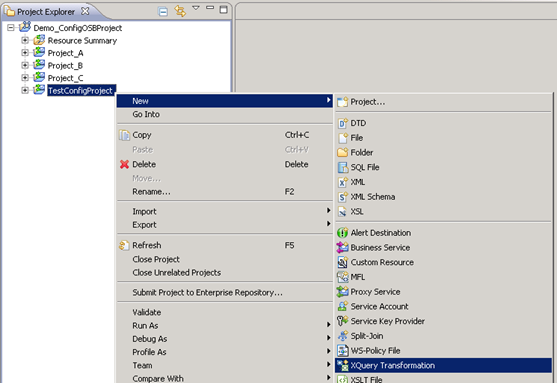 Create any OSB project (TestConfigProject), right click on the TestConfigProject and select New –> XQuery Transformation as shown below.