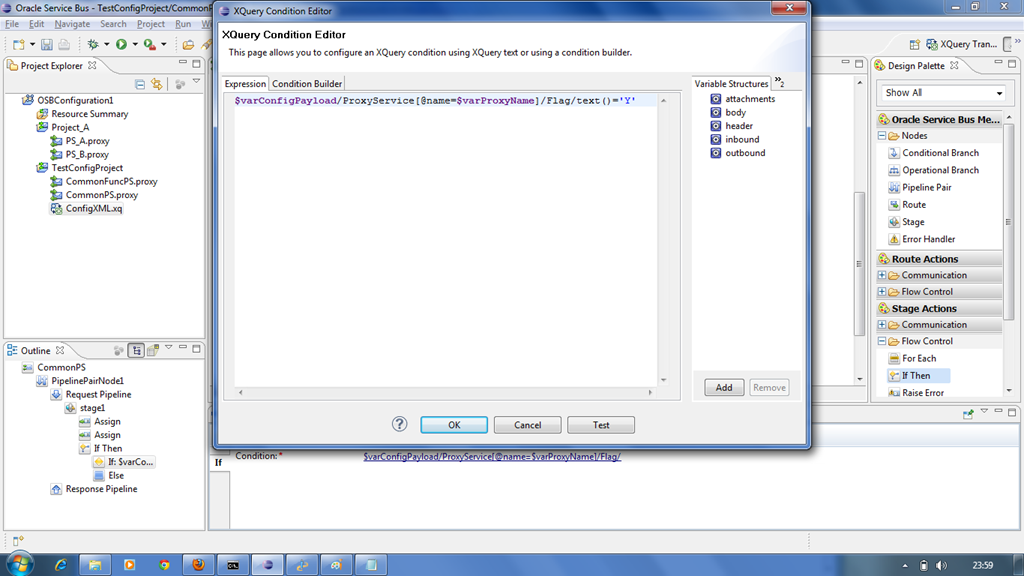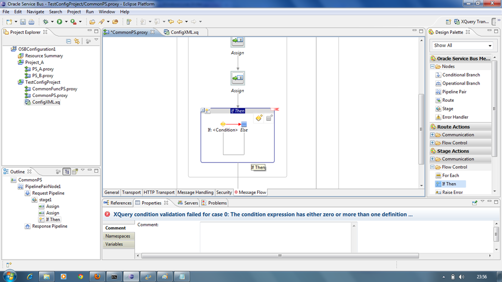 We have a variable where the configuration information is stored for all the proxies and also we have a variable which gives the information about calling proxy. Now we need to check whether audit flag is enabled or not before calling the CommonFuncPS. So insert If-Then activity from Stage Actions –> Flow Control as shown below.