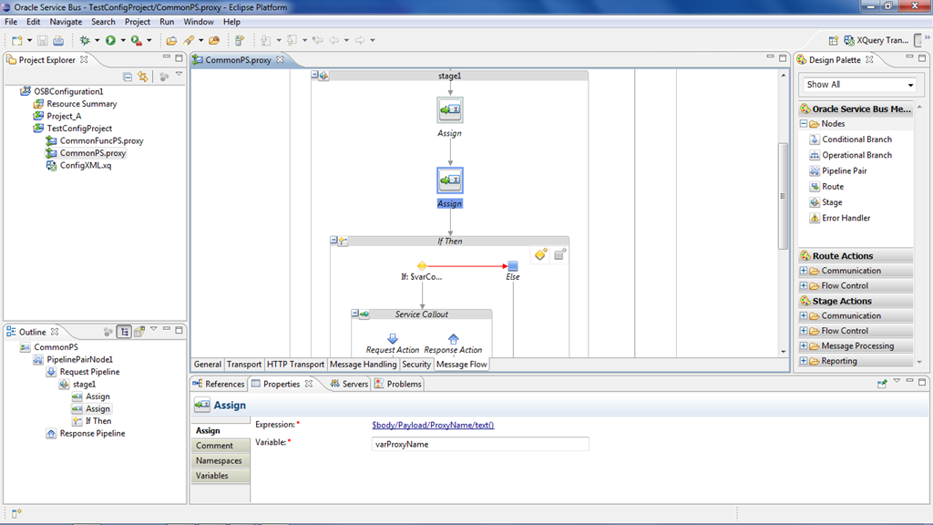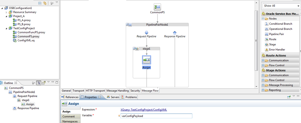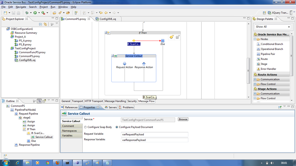 Now insert a service callout to call the CommonFuncPS and set the variables as shown below. Since this article is about the configurable properties we will not look at the actual message flow of CommonFuncPS.