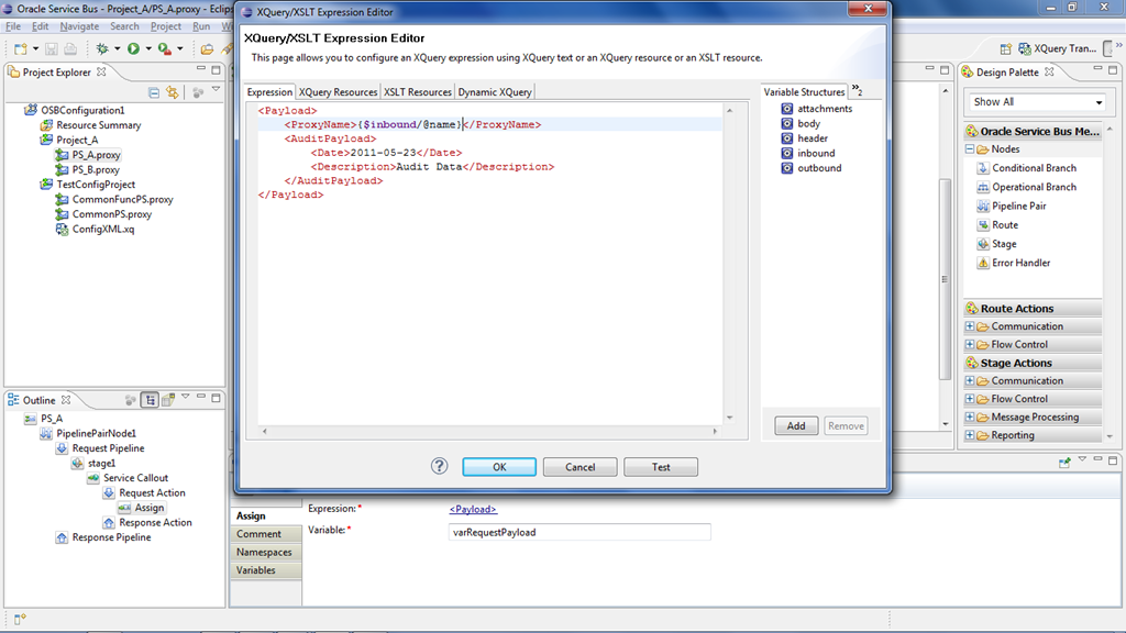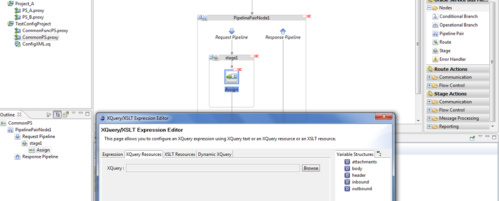 Go to the message flow of the proxy service and insert a pipelinepair Node and Stage and insert an assign activity. Click on the ’Éxpression’ in the properties and select XQuery resource as shown below.