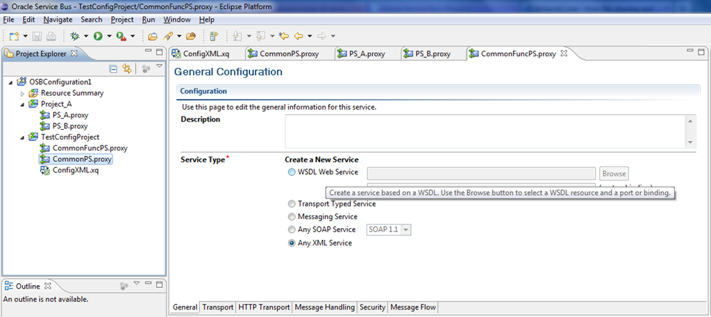 To achieve this, let’s create another proxy service CommonPS that checks for this configuration property value and calls CommonFuncPS based on the value given in the XQuery resource. The following screenshot shows all the proxy services that are involved in this exercise and let’s create all proxy services as ‘Any XML Service’ for simplicity.
