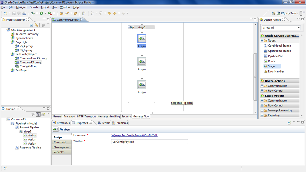 In the following screenshot, 1st assign action loads contents XQuery resource and stores it in ‘varConfigPayload’ variable. The 2nd assign action gets the proxy name sent in payload using ‘$body/Payload/ProxyName/text()’ and stores it in ‘varProxyName’ variable. And the 3rd assign activity uses ‘$varConfigPayload/ProxyService[@name=$varProxyName]/Flag/text()’ to get the value from XQuery resource and store it in ‘varFlagValue’ variable.