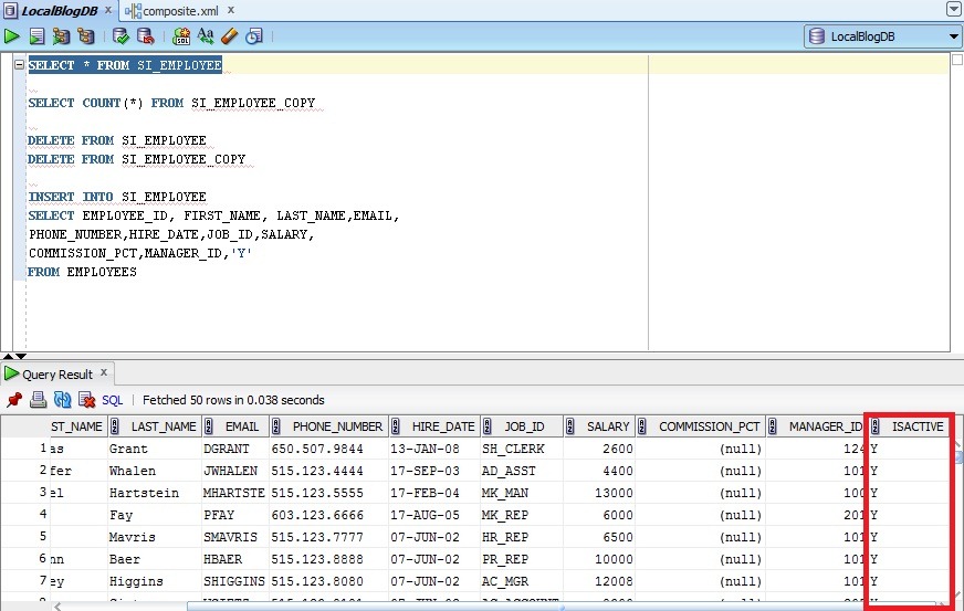 In this polling strategy, a column in the table is marked with particular value to designate the logical delete thus avoids DB adapter to pick it up the same record again and again. Currently our table does not have any column for this purpose, so add a column ISACTIVE VARCHAR2(1) in source table.