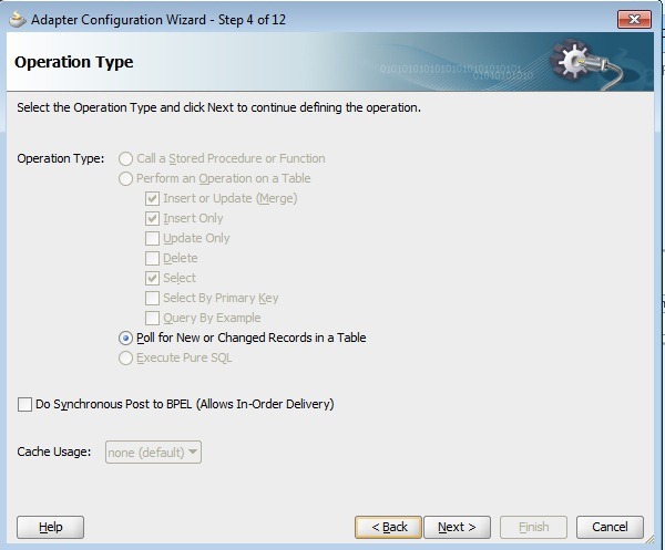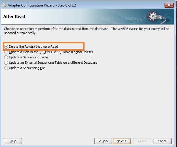 Create DB adapter files in JDeveloper by selecting Poll operation, source table and the polling strategy (After Read) as ‘Delete the Row(s) that were Read’.