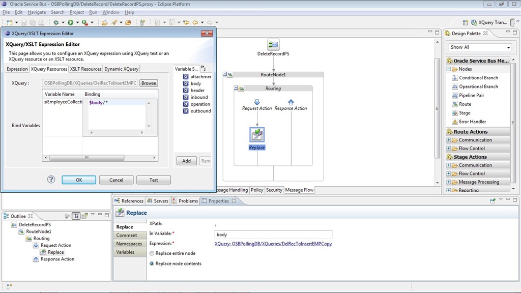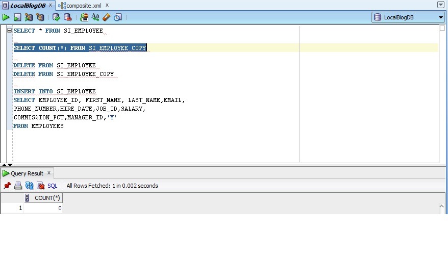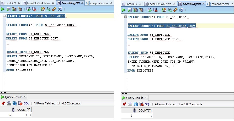 I had used a use case of migrating data (smaller volume) from SI_EMPLOYEE table (source) to SI_EMPLOYEE_COPY (target) using DB adapter in OSB for this demo. And JDeveloper 11.1.1.6 and OSB 11.1.1.6 are used for this demo.