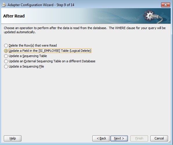 Create DB adapter files in JDeveloper by selecting Poll operation, source table and the polling strategy (After Read) as ‘Logical Delete’.