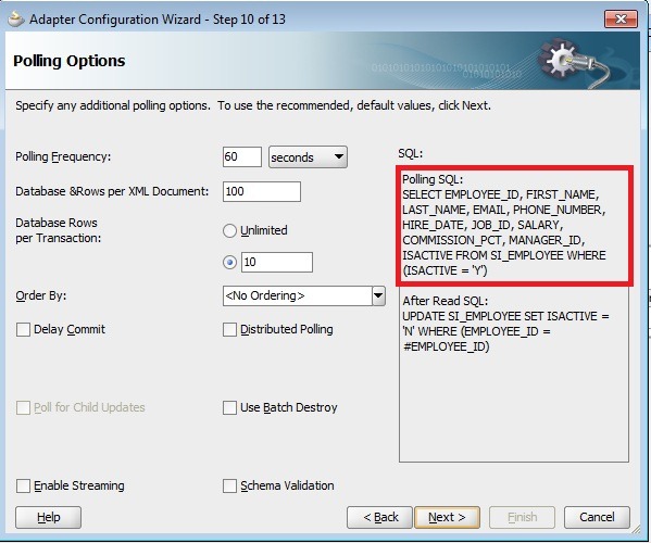 In the next step of DB wizard, one can verify SQL statement used for polling and finish the wizard.