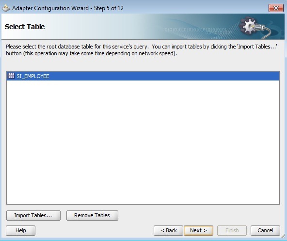 In the next step of the wizard, select target table and finish the DB wizard to create all necessary files (.JCA, mappings, properties, WSDL and XSD). Import all of these files into Eclipse IDE and create business service from JCA file.