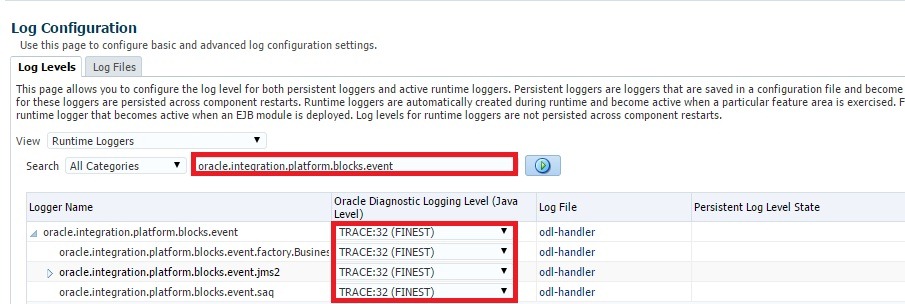 [2014-12-19T21:23:28.693+05:30] [soa_server1] [TRACE] [] [oracle.integration.platform.blocks.event.jms2.EdnBus12c] [tid: [ACTIVE].ExecuteThread: ’16’ for queue: ‘weblogic.kernel.Default (self-tuning)’] [userId: <anonymous>] [ecid: 7bd5dbff-2042-456b-aa50-4c833203de1b-0000149c,0:2] [APP: soa-infra] [J2EE_APP.name: soa-infra] [J2EE_MODULE.name: fabric] [WEBSERVICE.name: RaiseEvent_ep] [WEBSERVICE_PORT.name: execute_pt] [oracle.soa.tracking.FlowId: 9] [oracle.soa.tracking.InstanceId: 49] [oracle.soa.tracking.SCAEntityId: 11] [composite_name: EDNConsistencyCheck] [FlowId: 0000KdZGFD03z0WjLxyGOA1K^6wo00000N] [SRC_CLASS: oracle.tip.adapter.fw.log.LogManagerImpl] [SRC_METHOD: log] eis/wls/EDNxaDurableTopic EdnBus12c Returning adapter response for part