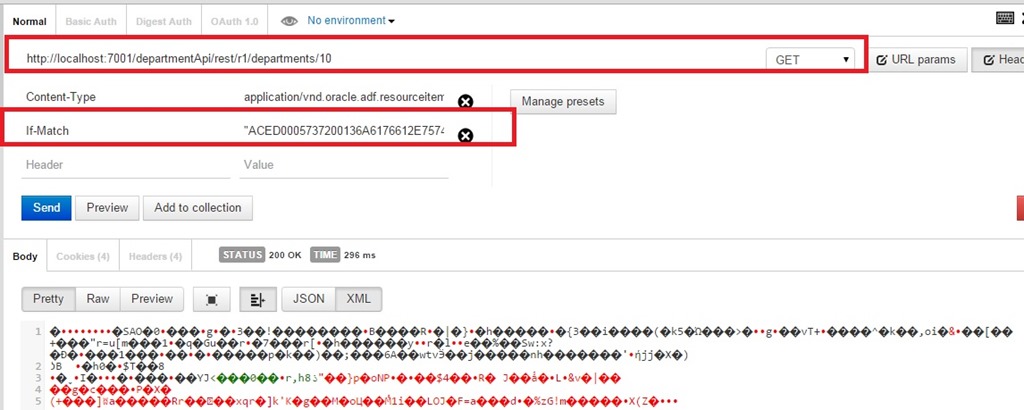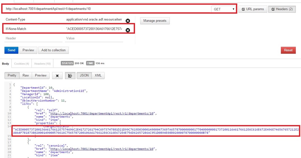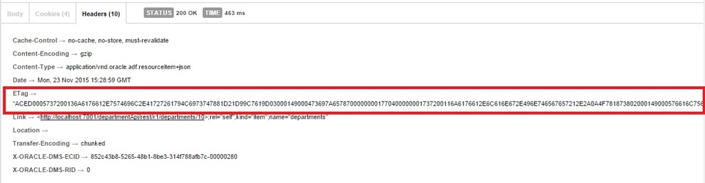 Now let us observe the behavior of REST resource when ETag is used for If-Match/If-None-Match HTTP headers during GET and PATCH. Basically these HTTP headers tells server to do requested operation when sent Etag value matches or did not match respectively.