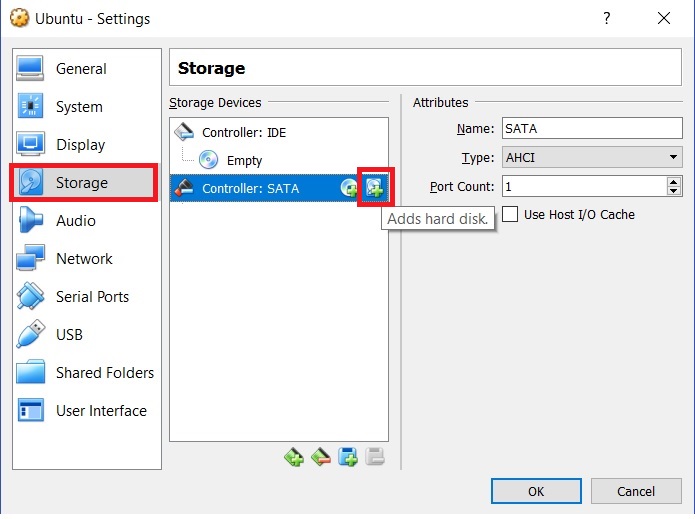 Again go to VM Settings -> Storage and click on add hard disk button high lighted below. Choose the above vdi which is moved to D drive and click OK. Now you should be restart the VM and proceed with your work with no issues.