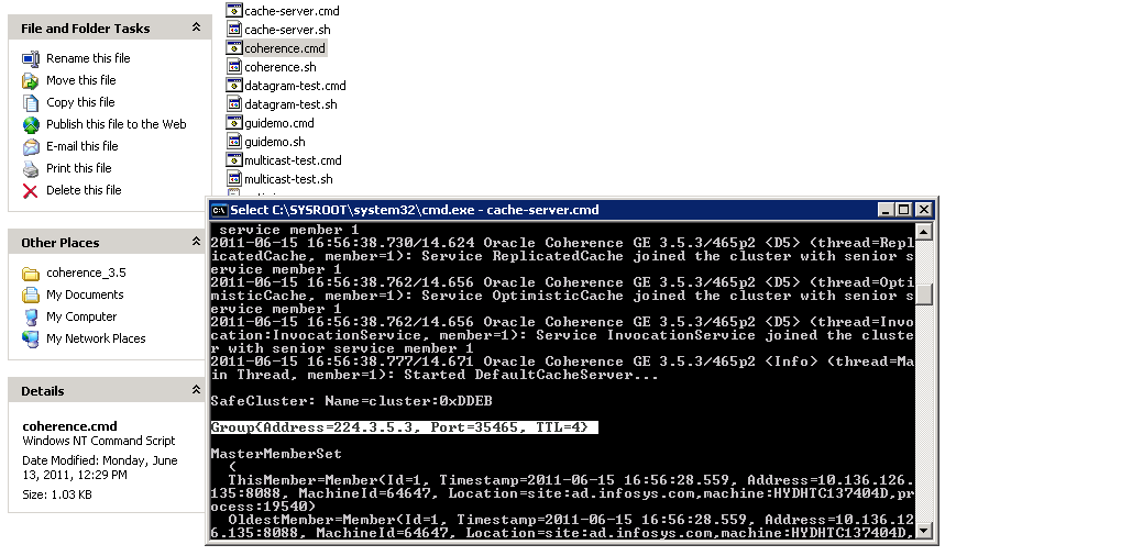 After trying out with Result Caching feature in OSB, i tried to use the coherence in integration with BPEL to store and retrieve the frequently used data in cache. As OTN puts it, “Coherence provides replicated and distributed (partitioned) data management and caching services on top of a reliable, highly scalable peer-to-peer clustering protocol”. In this post, i want to explain the setup i tried with using SOA Suite 11.1.1.3. The weblogic 10.3.3 installer comes with coherence 3.5