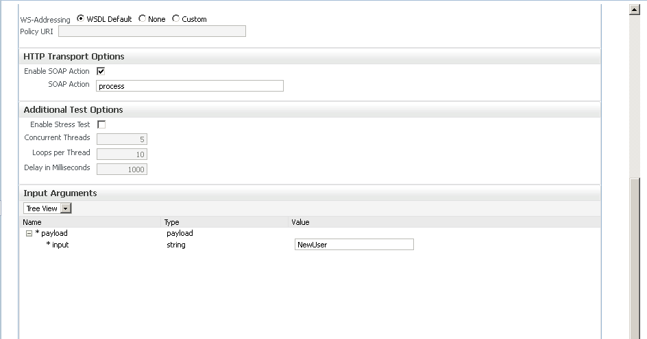 Run the BPEL by giving the value for ‘input’ element that does not exist in the cache currently. Here in this case, we are sending it as ‘NewUser’.