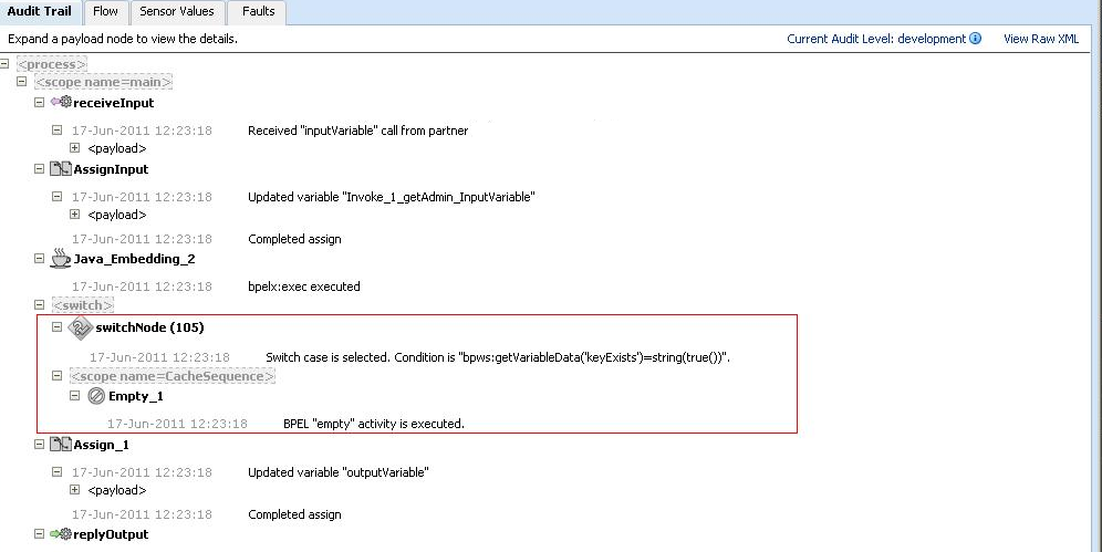 String cacheValue= ((oracle.xml.parser.v2.XMLElement) getVariableData("InvokeOutputVariable","parameters","/ns1:getResponse/val")).getFirstChild().getNodeValue();