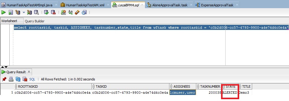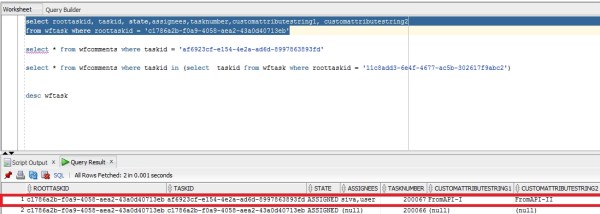 The commented lines in the above code is another way of achieving the same. Pass root task id or any child task id for this method call. We can verify this attachment in WFATTACHMENT table as shown below.
