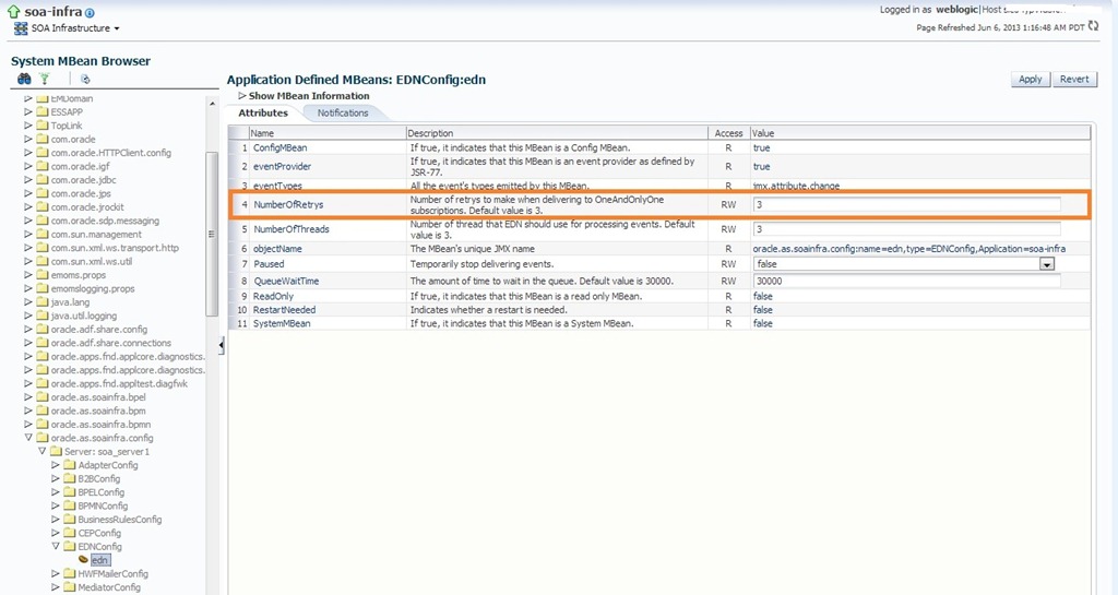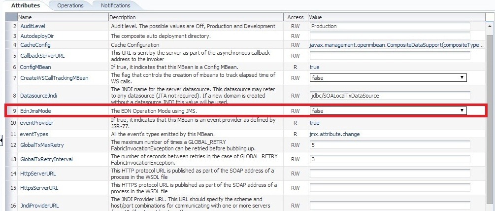Thirdly, in 11g EDN uses DB AQ 11g by default for publish and subscribe model of business events. This can be confirmed by verifying value of MBean property EdnJmsMode. False value denotes EDN using DB and True value denotes EDN using Weblogic JMS. You can verify by navigating to oracle.as.soainfra. config –> SoaInfraConfig –> soa-infra in Application Defined MBeans.