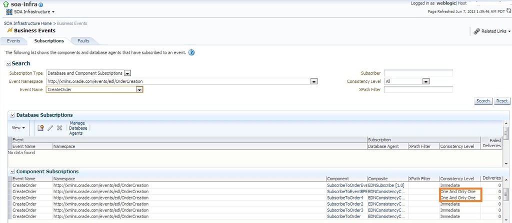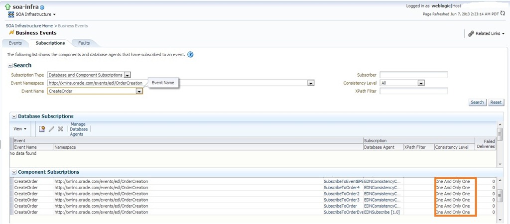 But in EM Console, we are still able to see immediate consistency level in the search region. You can navigate to this UI by selecting soa-infra –> Business Events.