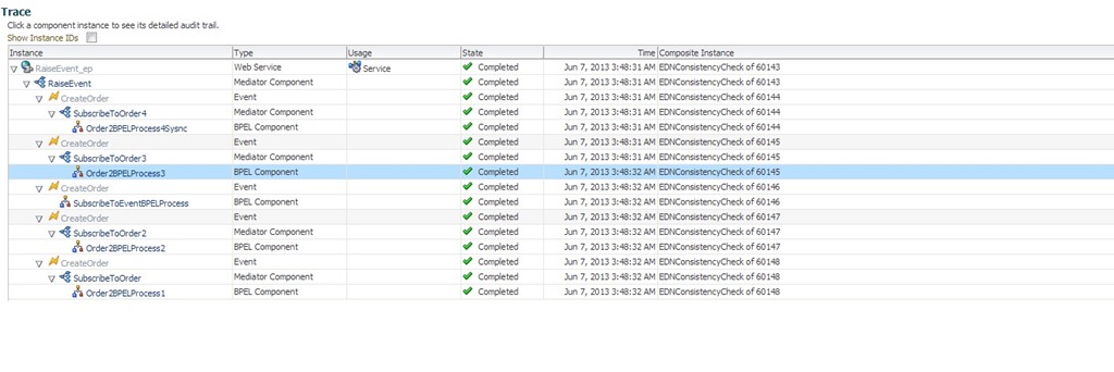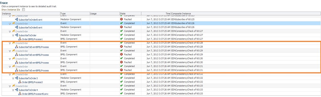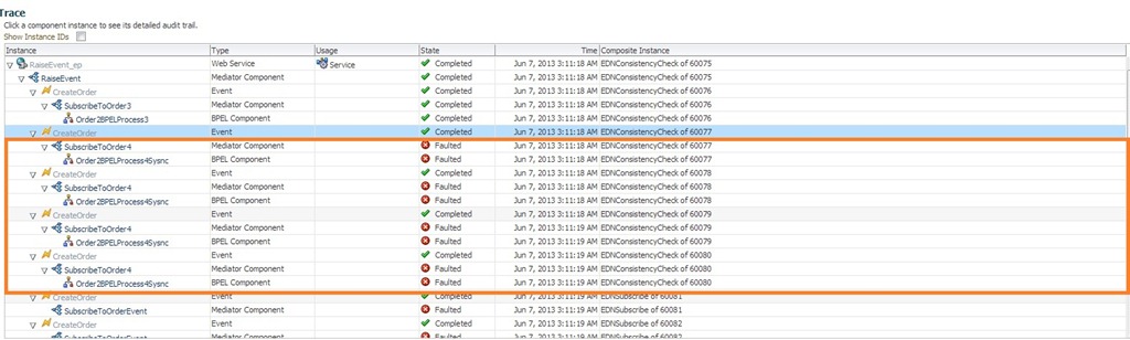 Now set bpel.config.oneWayDeliveryPolicy to sync for all the Asynchronous BPELs. Raise CreateOrder event and observe that all the instances are auto-retrying as the BPELs would be invoked in Synchronous manner.