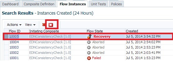 We can also do manual Retry or Abort from Flow Instances page. Selecting a Flow ID row will enable Abort Selected icon as shown below (if applicable).