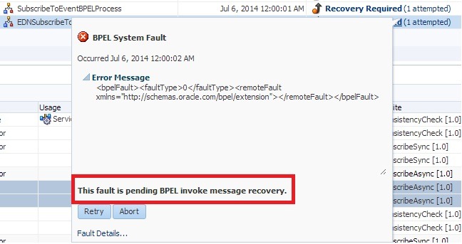 By clicking on the ‘Recovery Required’ link in Faults tab for this flow instance, we can observe that fault is pending for EDN recovery as shown below. From this popup, we can again do Retry manually or abort the flow using Retry and Abort buttons respectively.