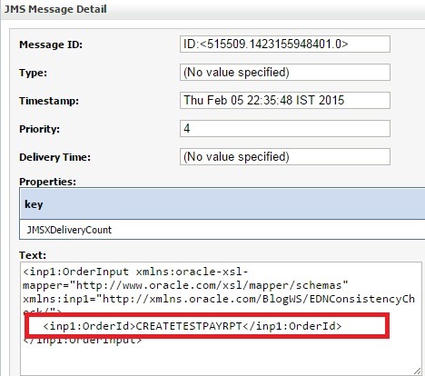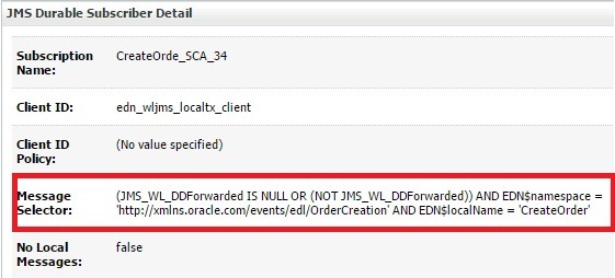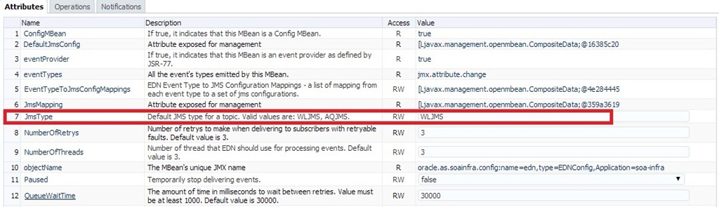 But in 12c, EDN uses Weblogic JMS by default. This can be confirmed by verifying value of MBean property JmsType . WLJMS value denotes EDN using Weblogic JMS and AQJMS value denotes EDN using AQ DB . You can verify by navigating to oracle.as.soainfra.config –> EDNConfig –> edn in Application Defined MBeans.