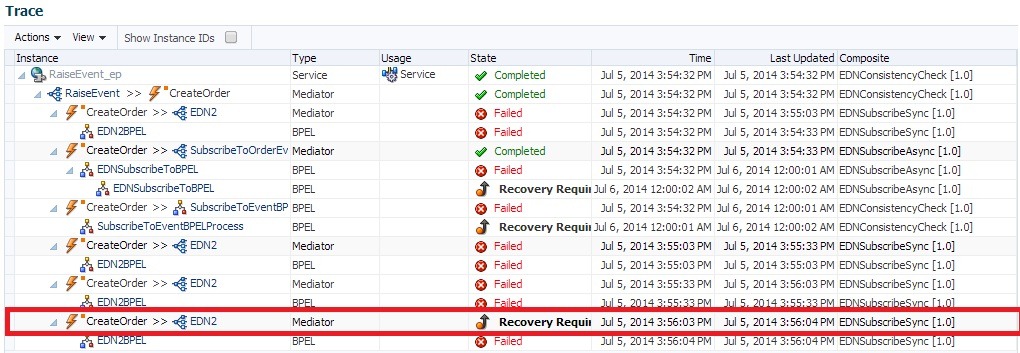 We can observe a lot of visual improvements in this Flow Trace screen. The composite instances are clearly marked as ‘Recovery Required’ and ‘Auto-retrying’ as applicable. As expected, the Asynchronous BPELs went into Auto Recovery and Event auto retry is happening for Synchronous BPEL process. Also note that all subscribers have received the business event raised though some faulted subscribers exist.