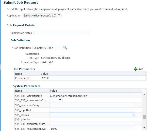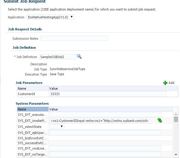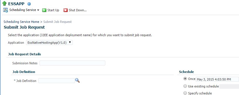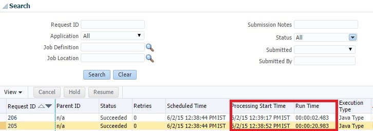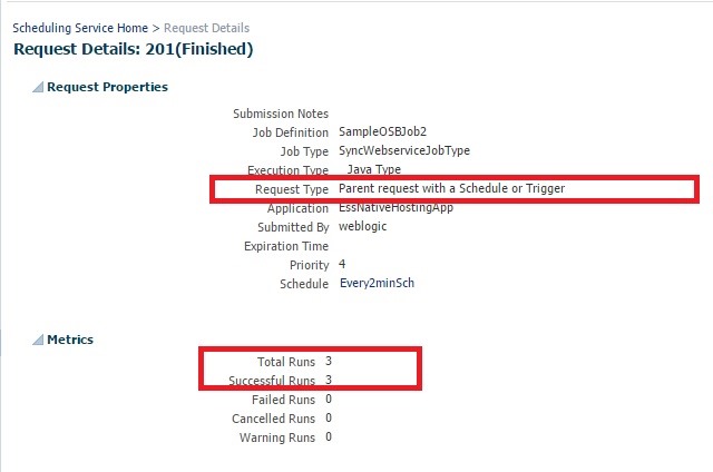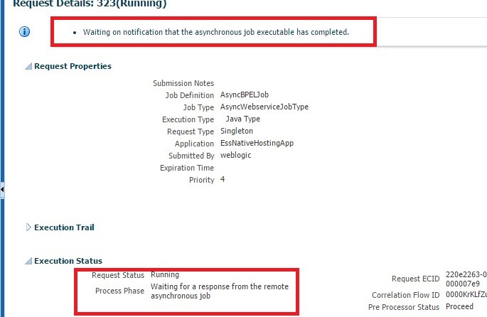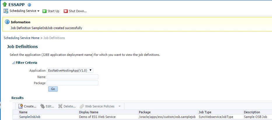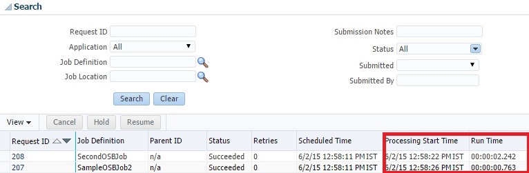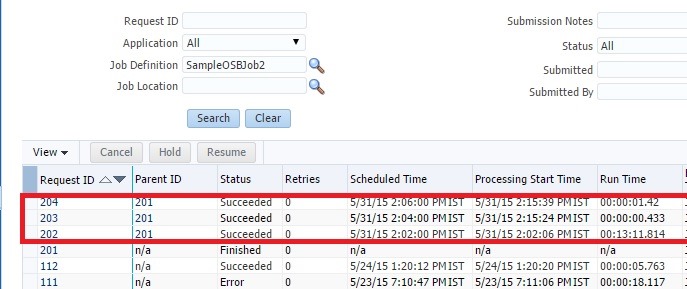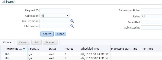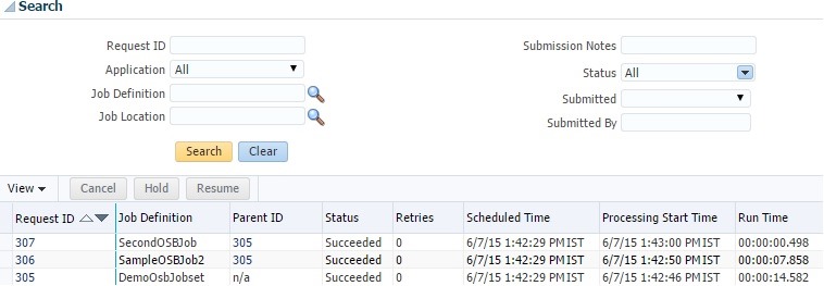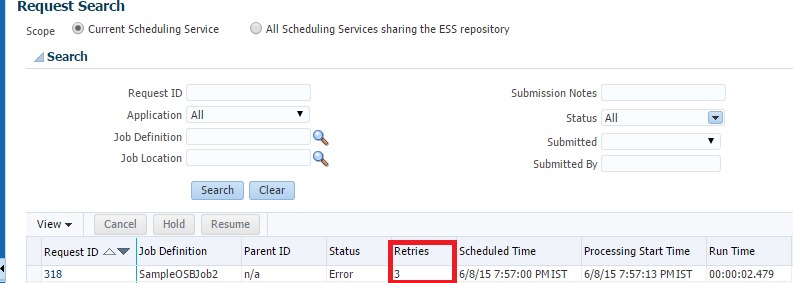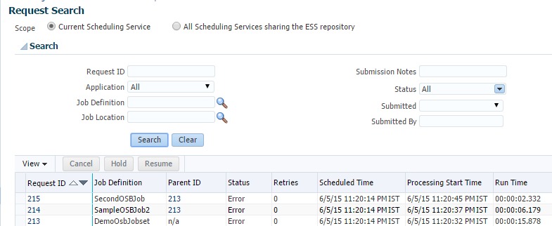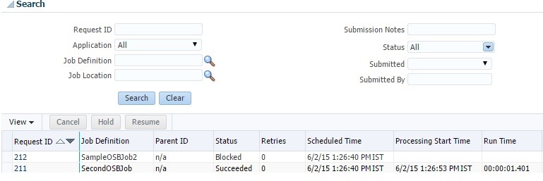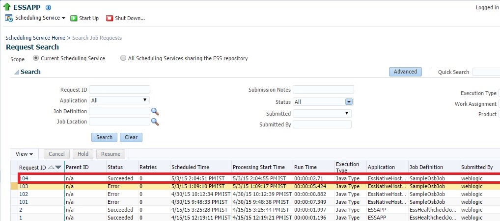 Navigate to ESSAPP –> Search Job Requests to see our job is submitted as expected and shows user as weblogic which is used in csf-key.