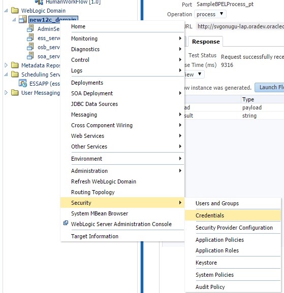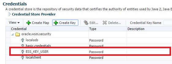 Since ESS Webservice is secured we need to attach the corresponding client policy to our Partner link and need to pass on the credentials of valid user. So as a first step, create a credential store key ESS_KEY_USER with weblogic credentials using the following steps in EM Console.