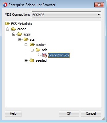 Double click on Schedule Job activity in BPEL to being up the below editor and select the required ESS job as shown in following screenshots. This way, we can also explore ESS jobs deployed to partition using different namespaces.
