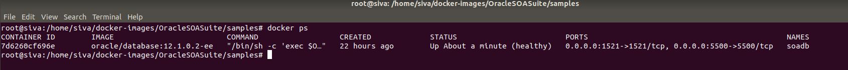 - Connect to db using command sqlplus sys/fusion@//172.18.0.1:1521/soadb as sysdba to make sure that DB is up and running.