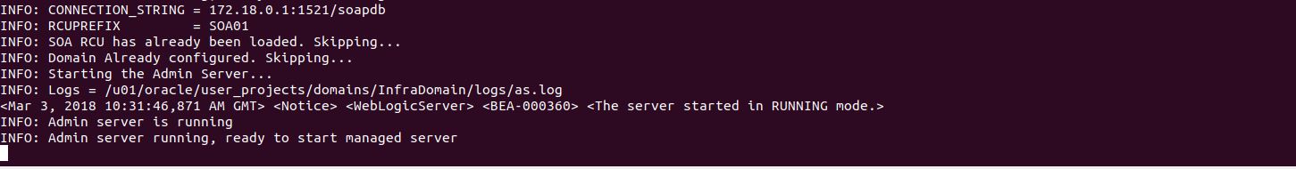 - When admin server container starts for first time, it runs RCU to create the required schemas by connecting to db container and also configures a new domain ,. The logs can be seen using command docker logs -f soaas.