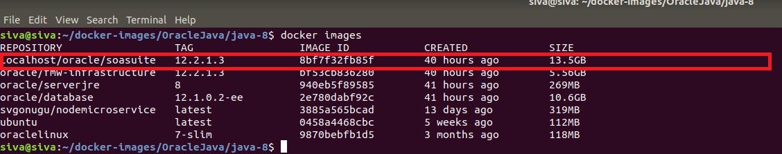 - Once the build is complete we can see a new image available with tag localhost/oracle/soasuite:12.2.1.3.