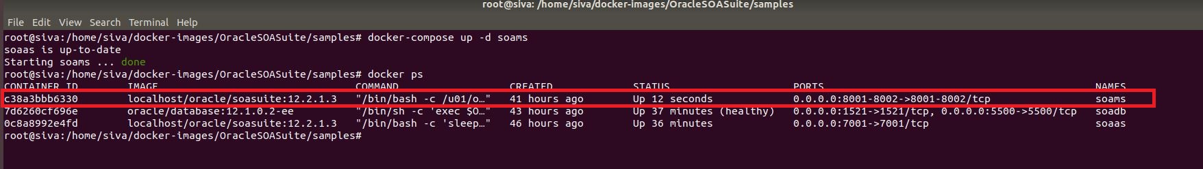 - After the first time, to restart the container we can use either of the below commands. Make sure to run source ../setenv.sh always before using docker-compose commands docker-compose up -d soaasdocker start <>