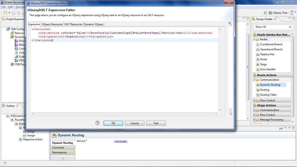 Consider a scenario where OSB has to route the incoming requests to 2 different services based on the CustomerType element value sent in the payload. So create a XQuery resource with the following contents. Observe that we are using the absolute path of business service in configuration as required by dynamic routing.